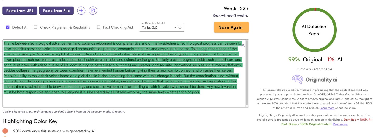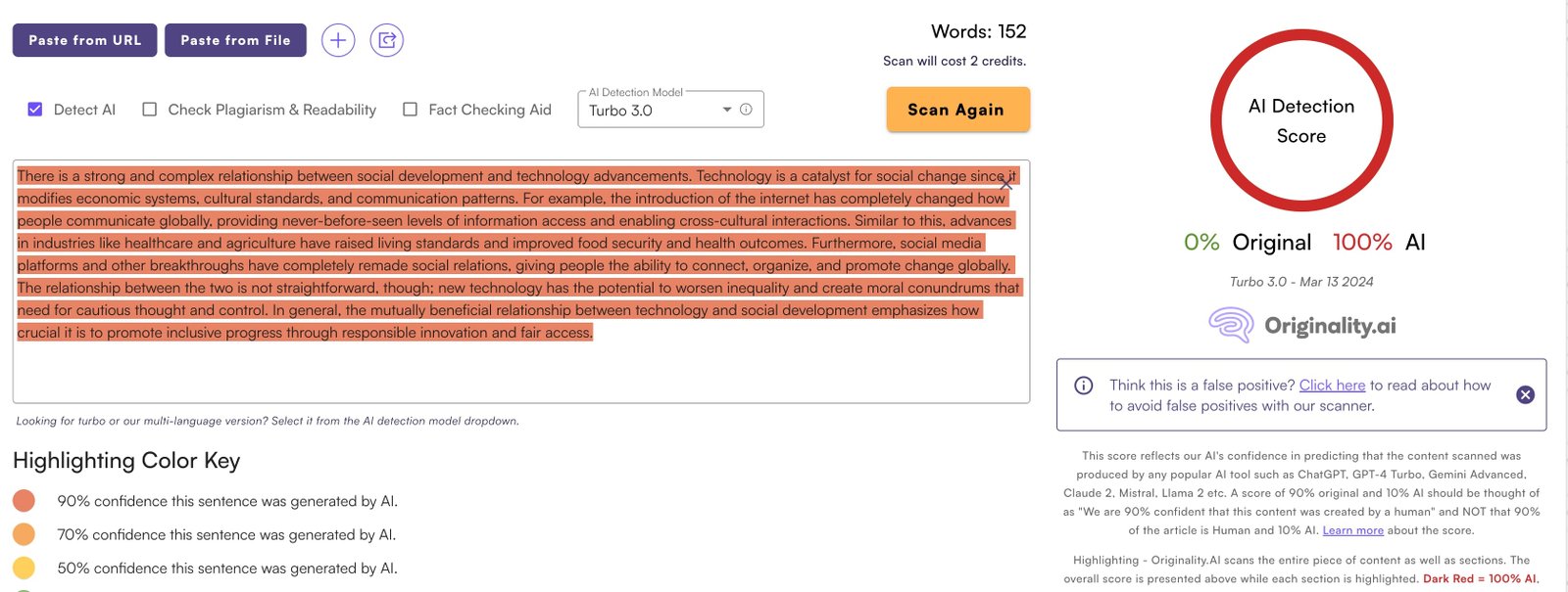 First, we want to use ChatGPT to generate 2 paragraphs for better testing accuracy. For the first testing paragraph, we are asking ChatGPT to write about the correlation between technology advances and social development.