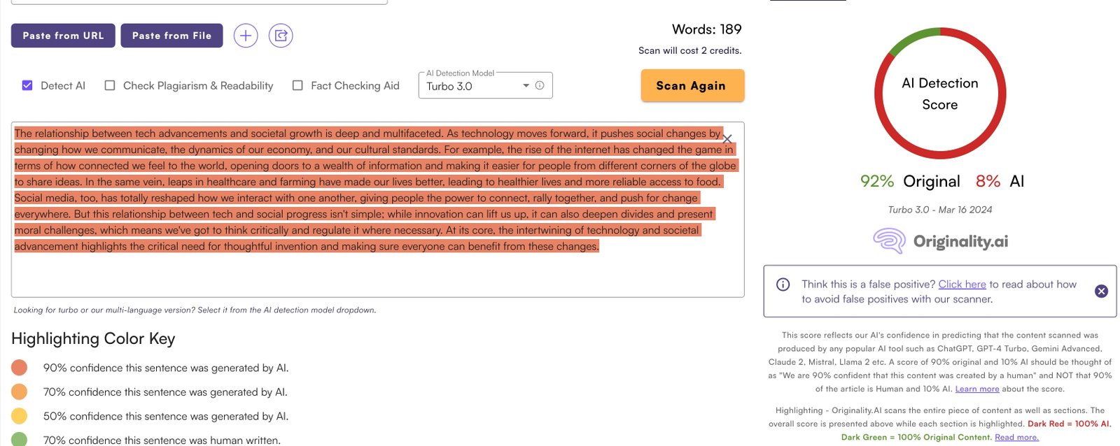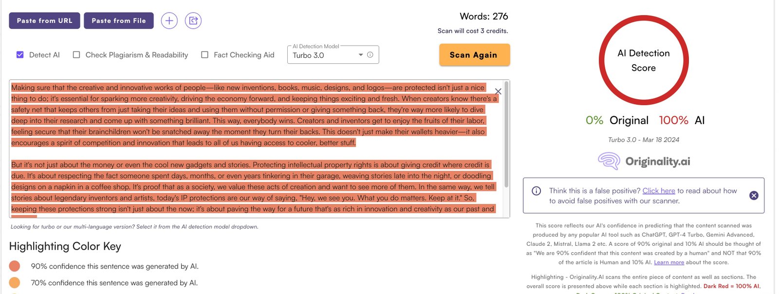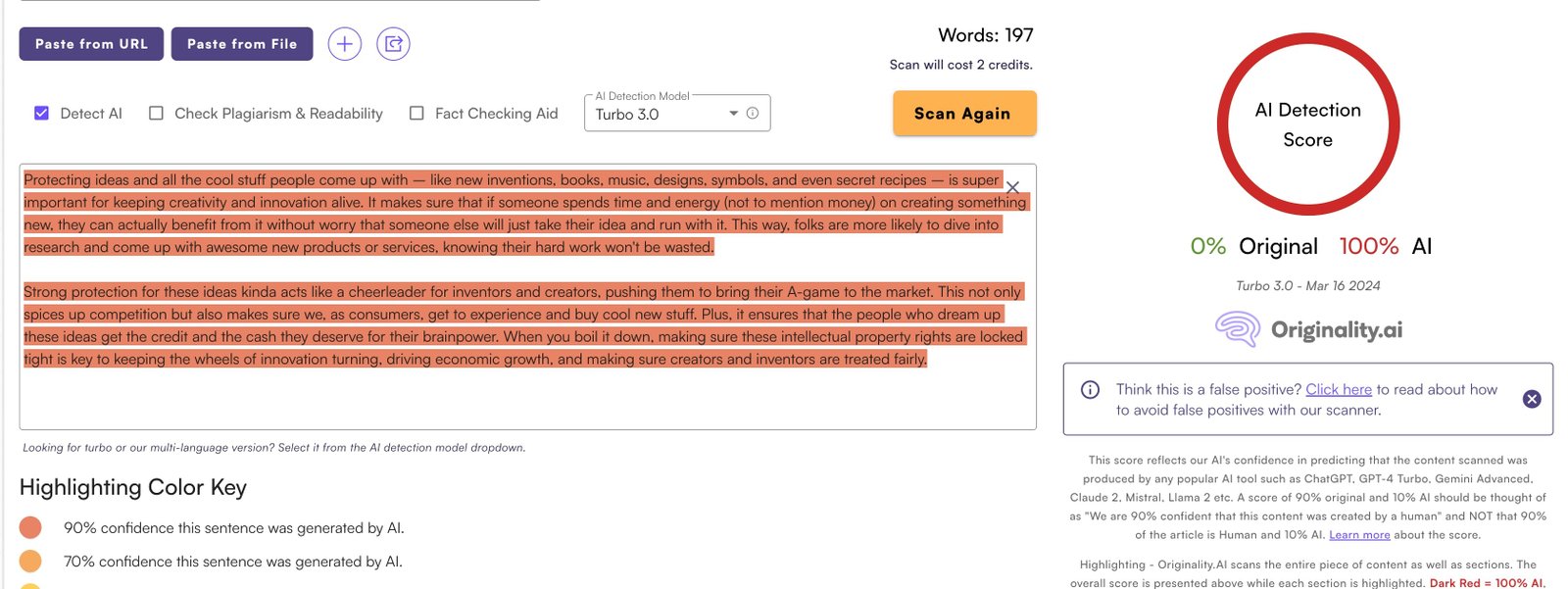 When looking at the results from Originality.ai, it may seem like the same "fully AI-generated" situation appears again. But please notice the color of the text. Originality is marking the "errored" text with a slightly lighter red (not that AI-like) compared to the previous dark red (100% fully AI-generated).