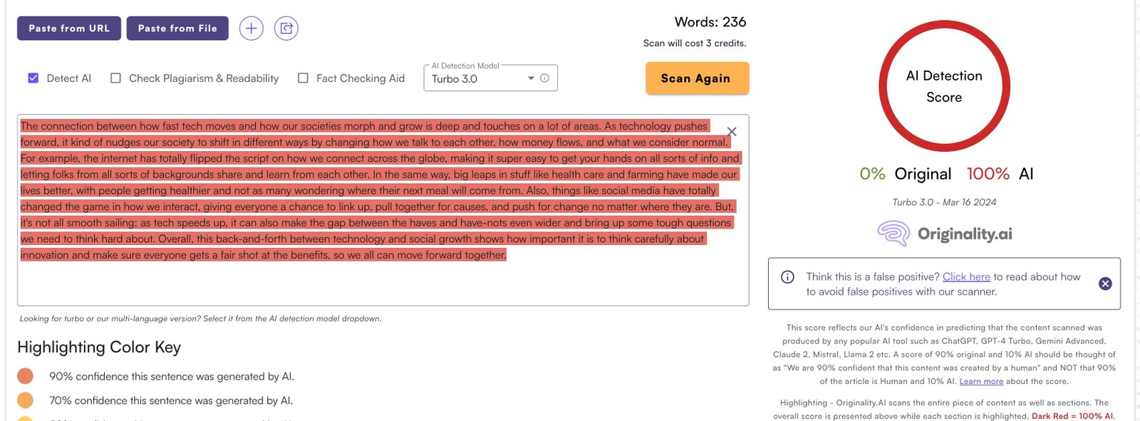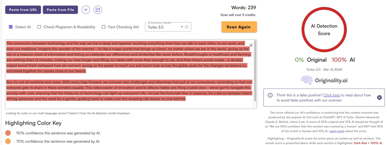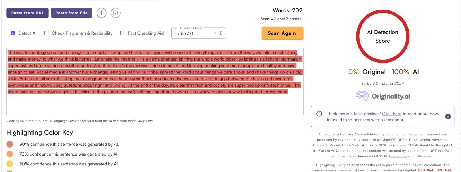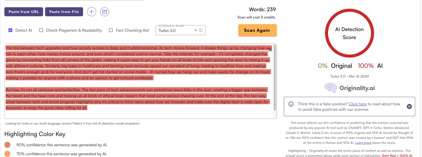 When looking at the results from Originality.ai, it may seem like the same "fully AI-generated" situation appears again. But please notice the color of the text. Originality is marking the "errored" text with a slightly lighter red (not that AI-like) compared to the previous dark red (100% fully AI-generated).